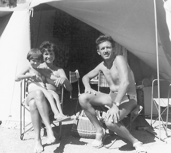 Lou, Pierre Coppier et Martine, leur troisième enfant, au camping du Bidule, 1959. (Collection Coppier)