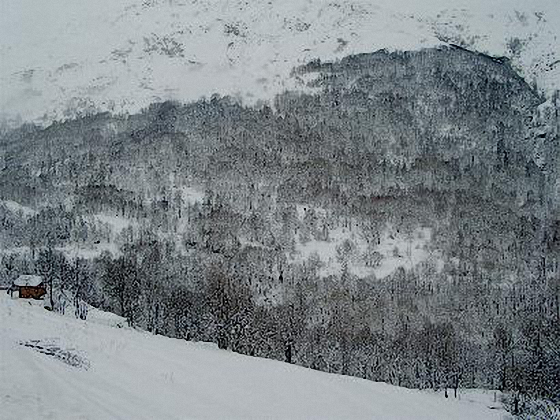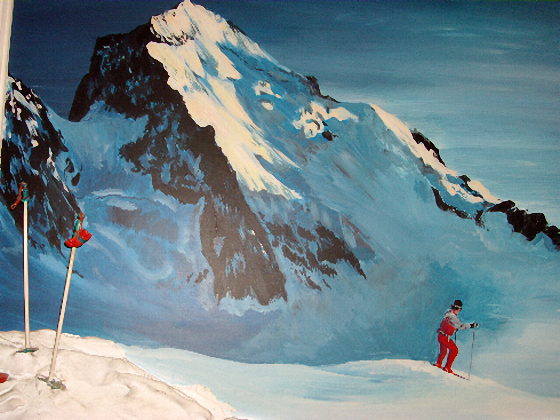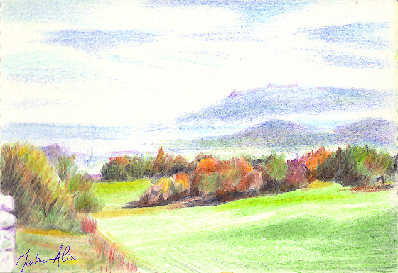 La vallée des Belleville (Savoie) en hiver. Cette nuit, la neige est tombée sur les sommets. Les sapins et les toitures craquent dans une gangue de givre. Tout la vallée semble transformée en cristal, dans un scintillement de givre aux ombres bleues. Le village apparaît au détour du chemin, surmonté des squelettes noirs des arbres comme des traits d’encre de Chine. (Gouache, encre de Chine, pastels)