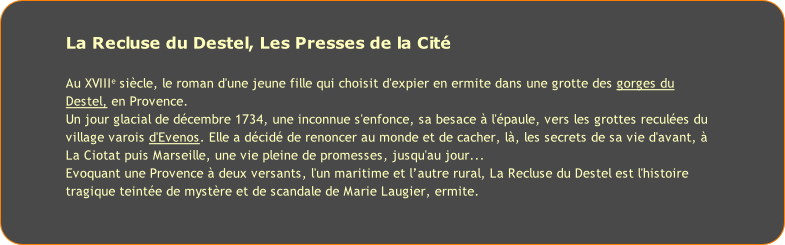 liens Evenos : les ruines du château Evenos : les ruines et la mer Evenos : l’église FERYANE LES PRESSES DE LA CITE Martine Alix COPPIER © mars 2015 - Conception : Pierre CJ VAISSIERE - Reproduction des textes et images soumise à autorisation #reclusecourty Idfm radio Enghien.mp3 Interview de M.A .Coppier par Laurence Ducourneau « Les mots, des livres » 15 fév 2014 - RADIO ENGHIEN MartineAlix2014-LaRecluseduDestel-FrBleu_perigord.mp3 Radio France-Bleu  Périgord « Le coin des lecteurs » MartineAlix2014-LaRecluseduDestel-FreqTerre.mp3 Frequence Terre Littérature sans frontière Chronique de Pierre Guelff La recluse du Destel La recluse du Destel La recluse du Destel #dedicaces2014 #LOUIS #RECLUSE pages88-89.pdf PAGES37-28-29.pdf #reclusedignois #reclusedignois #reclusedepeche commentaires