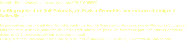 Bibliographie Schmil Emile WASERHOLE, « Schmil »  et  Martine Alix COPPIER Site officiel extraits acheter le livre Martine Alix COPPIER © mars 2015 - Conception : Pierre CJ VAISSIERE - Reproduction des textes et images soumise à autorisation #dedicaces90a2000 #conferschmil #SCHMIL